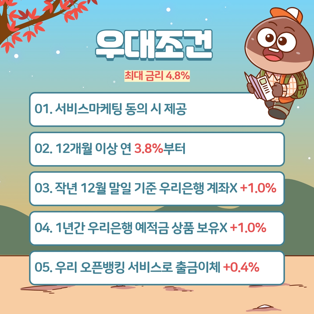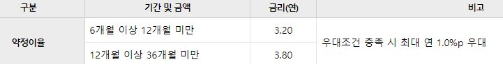 - 금리 : 3.80% (12개월), 최고 4.80%(12개월) / 기본금리 연 3.80%에 우대금리 최대 연 1.0% 적용하면 최고 연 4.8% 제공
