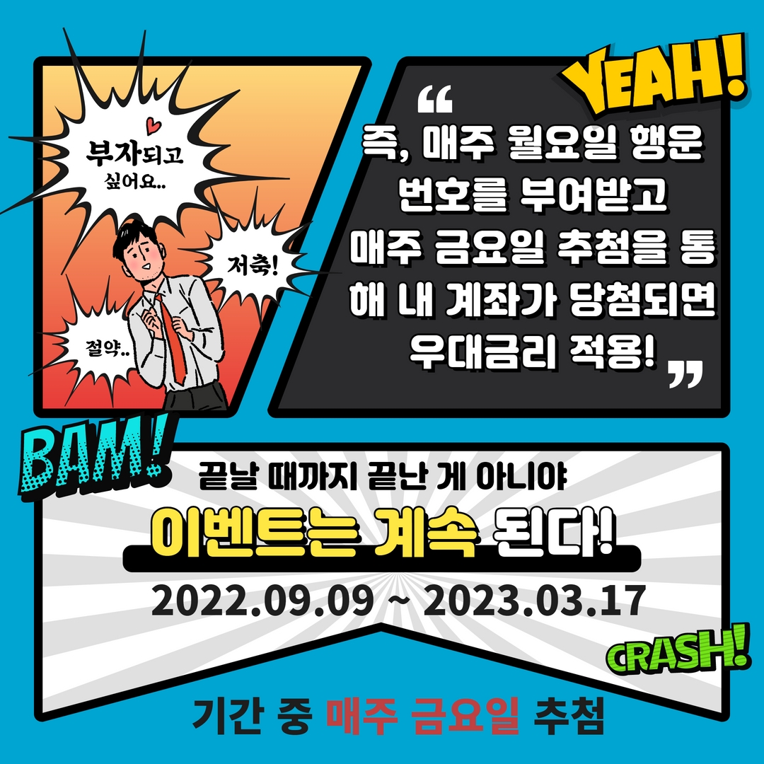 - 당첨 우대금리는 1회에 한하여 만기해지계좌에 적용되며, 이벤트 당첨되더라도 중도해지하는 경우 우대금리 제공되지 않고 중도해지금리가 적용됩니다.