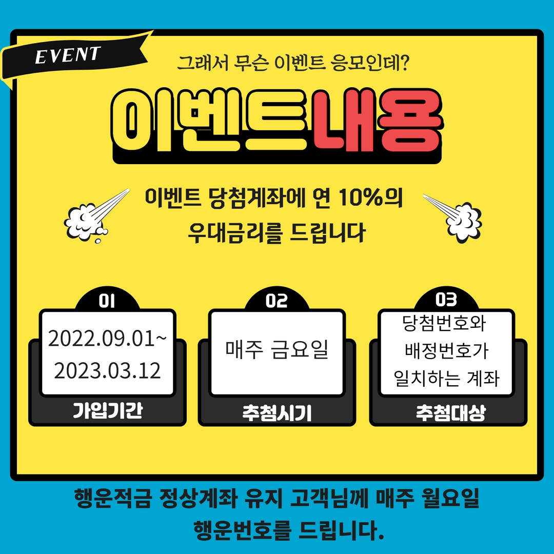 - 당첨 우대금리는 1회에 한하여 만기해지계좌에 적용되며, 이벤트 당첨되더라도 중도해지하는 경우 우대금리 제공되지 않고 중도해지금리가 적용됩니다.